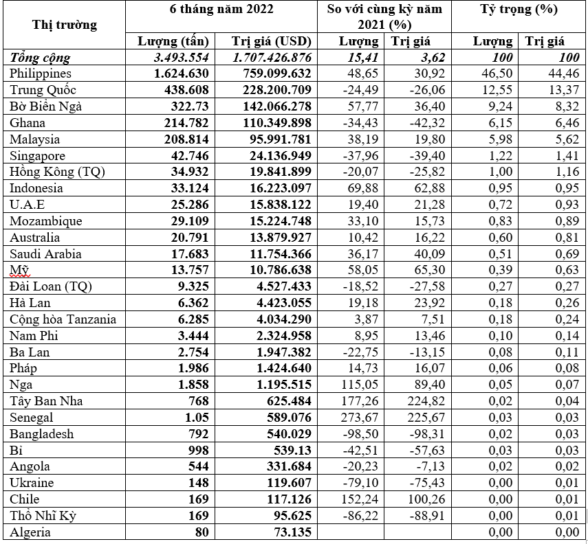 Trong 6 tháng qua, Philippines vẫn đứng đầu về tiêu thụ gạo của Việt Nam, chiếm 46,5% trong tổng lượng và chiếm 44,5% trong tổng kim ngạch gạo xuất khẩu của cả nước, đạt 1,62 triệu tấn, tương đương 759,1 triệu USD, giá trung bình 467 USD/tấn, tăng 48,7% về lượng, tăng 30,9% về kim ngạch nhưng giảm 11,9% về giá so với cùng kỳ năm 2021.