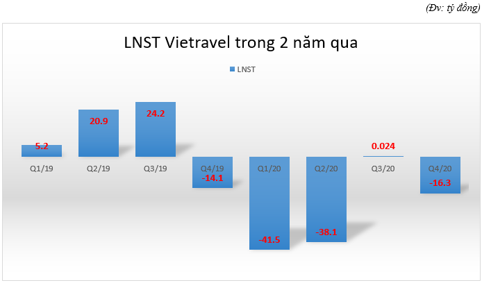 Trong năm 2020 do ảnh hưởng của dịch COVID-19 lĩnh vực du lịch chịu tổn thất nặng nề, Vietravel cũng không phải ngoại lệ khi lỗ sau thuế cả năm 90 tỷ đồng, trái ngược với khoản lãi 40 tỷ đồng của năm 2019.