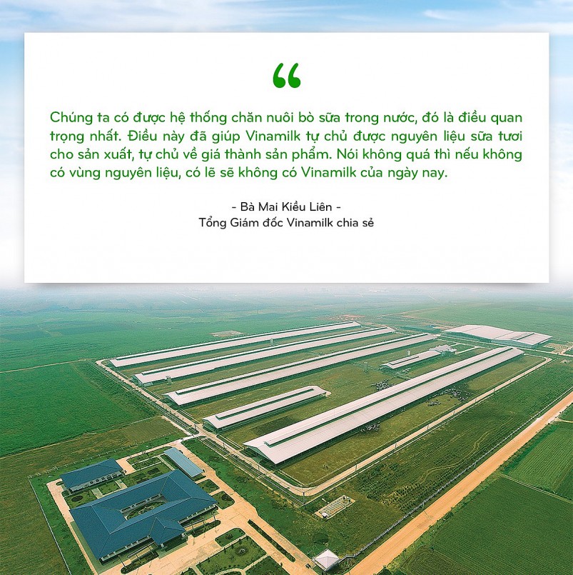 Sau 15 năm không ngừng đầu tư và phát triển, Vinamilk đã xây dựng hệ thống trang trại bò sữa đạt tiêu chuẩn quốc tế trong và ngoài nước, tiến tới chủ động được nguyên liệu sữa tươi chất lượng, đáp ứng nhu cầu về các sản phẩm sữa cho cả thị trường trong nước và xuất khẩu.