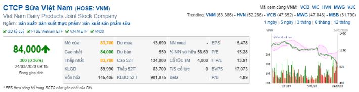Trên thị trường chứng khoán, mở cửa phiên giao dịch hôm nay 24/3 cổ phiếu VNM tăng lên mức giá 84.000 đồng/cp. Vốn hóa thị trường ghi nhận 145.405 tỷ đồng.