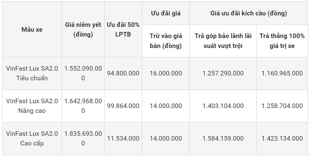 Tham khảo giá niêm yết mẫu xe VinFast Lux SA2.0 tháng 12/2023
