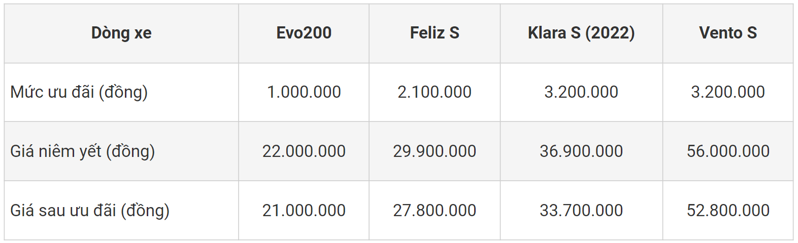 Cụ thể, từ ngày 15/10 đến hết ngày 30/10/2023, các mẫu xe máy tay ga của VinFast đều được bán ra với giá thấp hơn so với giá niêm yết, có xe được ưu đãi tới 3,2 triệu đồng. Đây là đợt khuyến mại rất lớn của VinFast, một thương hiệu xe máy điện nổi tiếng ở Việt Nam.