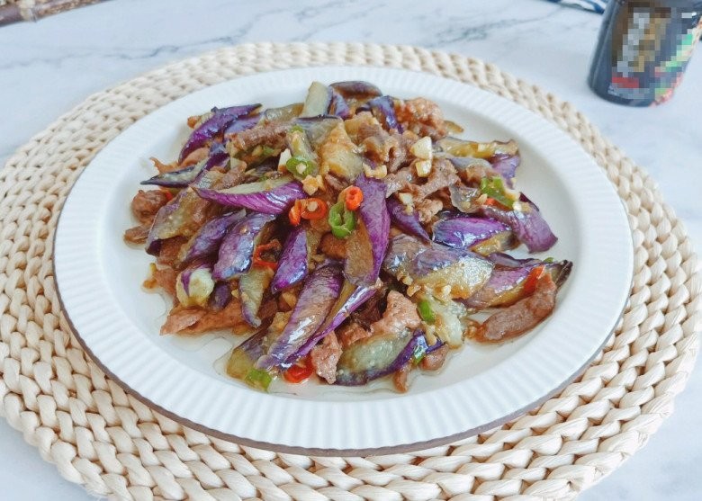 Sau đó cho cà tím vào, nêm nếm thêm hạt nêm, nước tương vừa đủ vào, đảo đều một lúc cho thịt và cà tím chín hoàn toàn thì tắt bếp. Rắc ít hành lá thái nhỏ nếu thích.