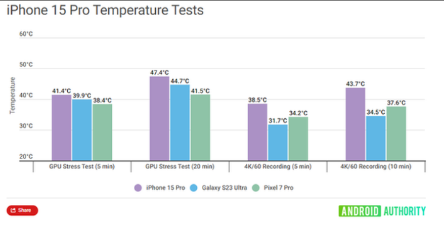 Khi so sánh với Samsung S23 Ultra và Google Pixel 7 Pro qua các tác vụ 3DMark Wild Life, quay video 4K@60fps, và sạc pin. iPhone 15 Pro đều có nhiệt độ nóng hơn từ 3 đến 7 độ C so với đối thủ.