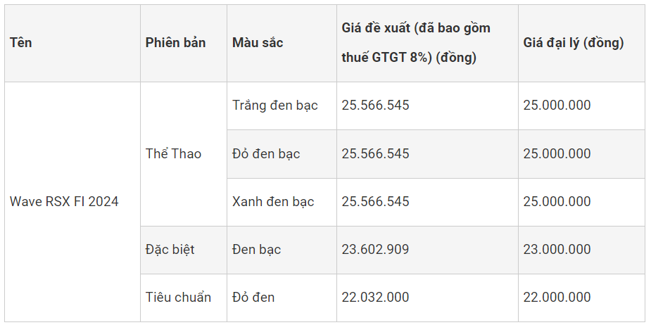 Honda Wave RSX FI 2024 được mở bán tại Việt Nam từ ngày 6/12/2023 với 3 phiên bản cùng mức giá đề xuất dao động từ 22 – 24,5 triệu đồng (đã bao gồm VAT 8%). Tuy nhiên, chỉ trong ít ngày bán chính thức, mẫu xe số này đã được các đại lý ưu đãi hàng triệu đồng.