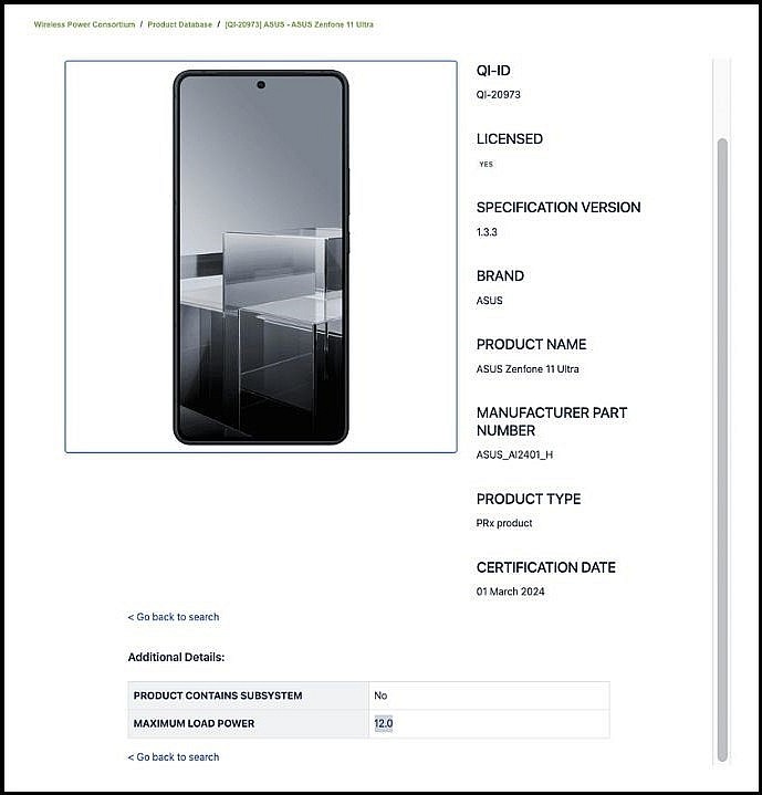 ASUS Zenfone 11 Ultra đã đạt được chứng nhận WPC với mã QI-ID là QI-20973 và số model ASUS_AI2401_H. ASUS Zenfone 11 Ultra đạt được chứng nhận vào ngày 1/3. Theo thông tin liệt kê, công suất tải tối đa là 12 W và dựa trên phiên bản QI 1.3.3 thay vì phiên bản mới nhất QI 2. Đáng chú ý hơn là phiên bản tiền nhiệm, Zenfone 10 Ultra, có sạc không dây 15 W.