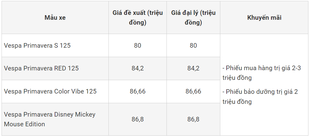 Về giá bán, những ngày cận Tết Nguyên đán 2024, khảo sát một đại lý xe ga Vespa ở Ba Đình, Hà Nội cho thấy, người mua xe ga Vespa Primavera sẽ được tặng 1 phiếu mua hàng trị giá 3 triệu đồng và một voucher bảo dưỡng trị giá đến 2 triệu đồng. Nếu không thích phiếu mua hàng, khách hàng có thể đổi sáng tiền mặt và trừ thẳng vào tiền xe.