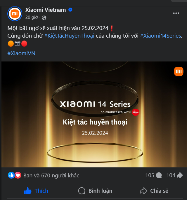 Hôm qua (06/02), Xiaomi đã chính thức xác nhận sự kiện ra mắt toàn cầu của Xiaomi 14 series thông qua các bài đăng trên các nền tảng như Facebook và X. Trong bài đăng trên fanpage Facebook Xiaomi Vietnam cho biết, sự kiện ra mắt dòng máy này sẽ diễn ra vào ngày 25/02 sắp tới.