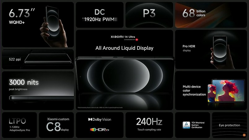 Phía trước Xiaomi 14 Ultra là tấm nền OLED TCL C8 LTPO, kích thước 6.73 inch với độ phân giải 2K (3,200 x 1,440 pixel), hỗ trợ công nghệ HDR Vivid và Dolby Vision, cung cấp độ sáng tối đa 3000 nits, tấn số quét thích ứng từ 1 - 120Hz, được bảo vệ bởi kính cường lực Shield Glass và mật độ điểm ảnh 522 PPI. Thiết kế màn hình dạng đục lỗ chứa camera selfie có độ phân giải 32MP, hỗ trợ quay phim 4K@60fps.