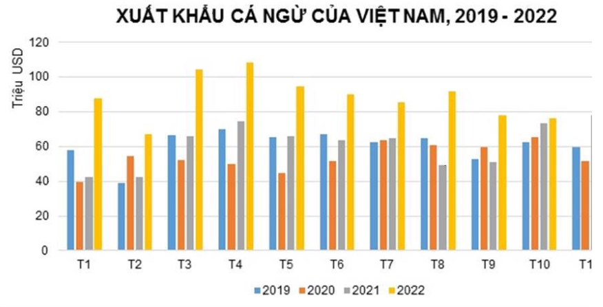 Giá trị xuất khẩu cá ngừ trong tháng 10/2022 chỉ tăng 4% so với cùng kỳ năm 2021, đạt hơn 76 triệu USD, mức thấp thứ 2 kể từ đầu năm tới nay. Với tình hình lạm phát tại các nước như hiện nay, xuất khẩu cá ngừ khó giữ được đà tăng trưởng.