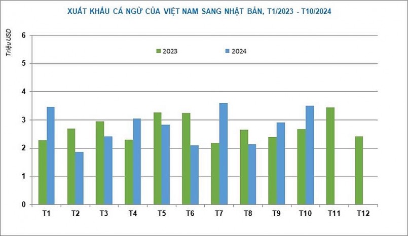 Con số trên góp phần bù đắp lại lượng sụt giảm xuất khẩu sang Nhật Bản trong nửa đầu năm, nâng tổng giá trị xuất khẩu trong 10 tháng đầu năm 2024 lên gần 28 triệu USD, tăng 5% so với cùng kỳ.