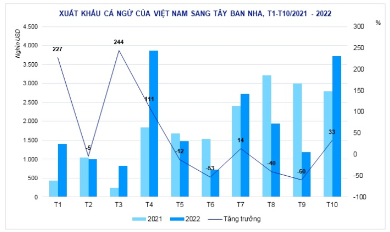 Sau khi sụt giảm vào năm 2021, xuất khẩu cá ngừ của Việt Nam sang Tây Ban Nha trong 10 tháng đầu năm 2022 vẫn chưa phục hồi, chỉ ở mức tương đương so với cùng kỳ.
