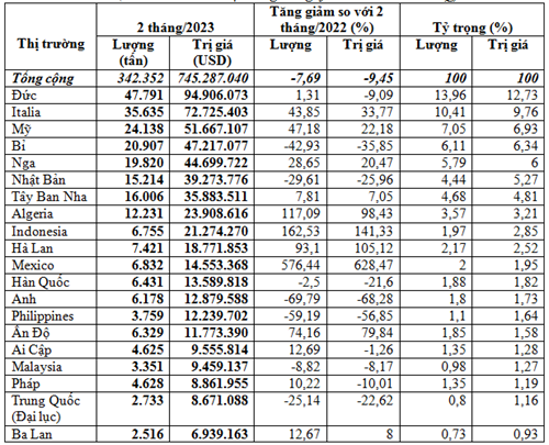 Cà phê của Việt Nam xuất khẩu nhiều nhất sang thị trường Đức trong 2 tháng đầu năm 2023, chiếm 14% trong tổng lượng và chiếm 12,7% trong tổng kim ngạch xuất khẩu cà phê của cả nước, đạt 47.791 tấn, tương đương 94,91 triệu USD, giá 1.986 USD/tấn, tăng 1,3% về lượng, nhưng giảm 9,1% về kim ngạch và giảm 10,3% về giá so với 2 tháng đầu năm 2022; riêng tháng 2/2023 xuất khẩu đạt 26.304 tấn, tương đương 52,54 triệu USD, tăng 22,4% về lượng, tăng 24% kim ngạch so với tháng 1/2023.