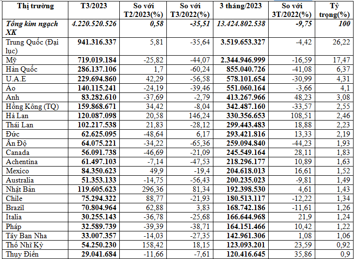 Nhìn chung, xuất khẩu điện thoại và linh kiện sang hầu hết các thị trường trọng điểm trong 3 tháng đầu năm 2023 sụt giảm kim ngạch so với cùng kỳ năm 2022.