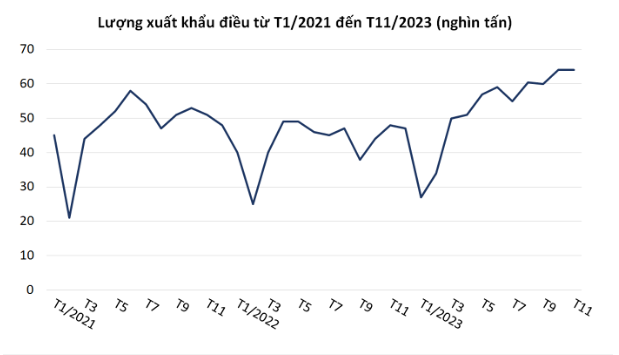 Tính chung 11 tháng năm 2023, xuất khẩu hạt điều của Việt Nam đạt 581.000 tấn, trị giá 3,3 tỷ USD, tăng 23% về lượng và tăng 17% về trị giá so với cùng kỳ năm 2022.