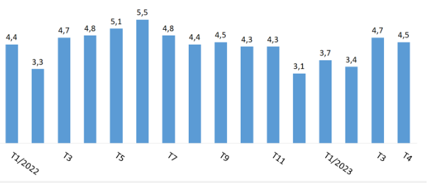 | Kim ngạch xuất khẩu nông lâm thủy sản từ năm 2022 - 4/2023. (Biểu đồ: Hoàng Anh) |