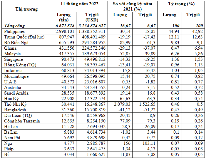 Philippines vẫn đứng đầu về tiêu thụ gạo của Việt Nam, chiếm 44,9% trong tổng lượng và chiếm 42,9% trong tổng kim ngạch gạo xuất khẩu của cả nước, đạt gần 3 triệu tấn, tương đương 1,39 tỷ USD, giá trung bình 463 USD/tấn, tăng 30% về lượng, tăng 18% về kim ngạch nhưng giảm 9,3% về giá so với 11 tháng đầu năm 2021.