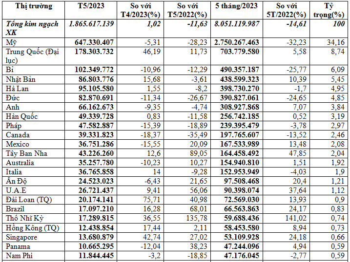 Trong số rất nhiều thị trường xuất khẩu giày dép, thì Mỹ đạt kim ngạch lớn nhất 2,75 tỷ USD, chiếm 34,2% trong tổng kim ngạch xuất khẩu nhóm hàng này của cả nước, giảm 32,2% so với cùng kỳ năm 2022. Riêng tháng 5/2023 đạt 647,33 triệu USD, giảm 5,3% so với tháng 4/2023 và giảm 28,2% so với tháng 5/2022.