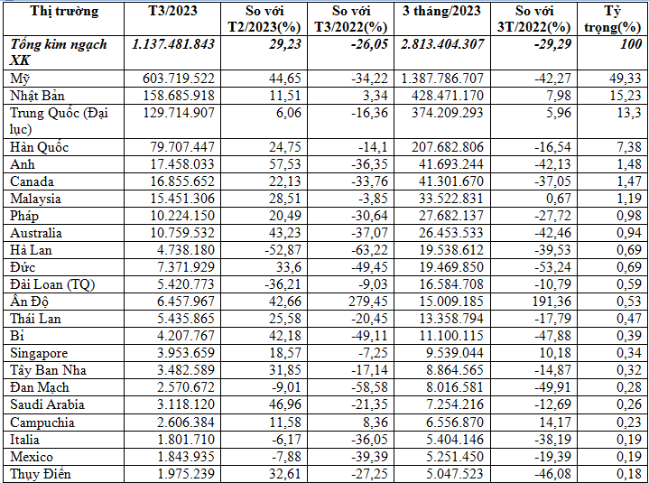 Nhóm hàng gỗ và sản phẩm gỗ của Việt Nam xuất khẩu chủ yếu sang thị trường Mỹ, riêng thị trường đã chiếm tới 49,3% trong tổng kim ngạch xuất khẩu nhóm hàng này của cả nước, đạt 1,39 tỷ USD, giảm 42,3% so với cùng kỳ năm trước, riêng tháng 3/2023 xuất khẩu sang thị trường này đạt 603,72 triệu USD, tăng 44,7% so với tháng 2/2023 nhưng giảm 34,2% so với tháng 3/2022.