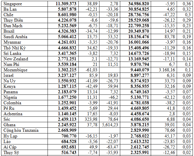 Hàng dệt may xuất khẩu sang thị trường Đông Nam Á chiếm 6,3%, đạt trên 613,59 triệu USD, giảm 7,2% so với 4 tháng đầu năm 2022; xuất khẩu sang thị trường EU chiếm 11,3%, đạt trên 1,09 tỷ USD, giảm 12%