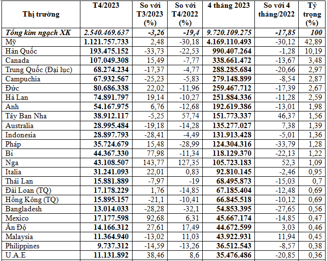 Tính chung cả 4 tháng đầu năm 2023 kim ngạch xuất khẩu nhóm hàng dệt may đạt 9,72 tỷ USD, giảm 17,9% so với cùng kỳ năm 2022.