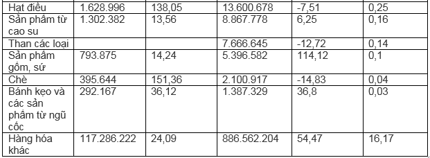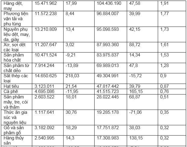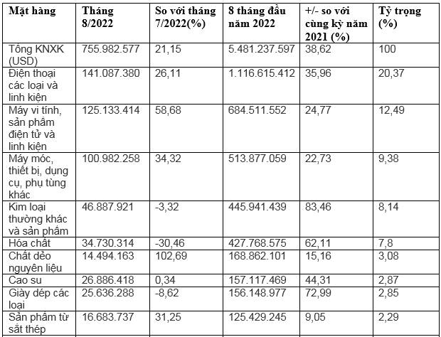 Trong 8 tháng đầu năm 2022, kim ngạch xuất khẩu một số nhóm mặt hàng có mức tăng trưởng so với cùng kỳ 8 tháng năm 2021: Hóa chất tăng 62,1%; giày dép các loại tăng 72,9%; xơ sợi dệt các loại tăng 88,7%; cà phê tăng 65,1%; thủy sản tăng 138,1%.