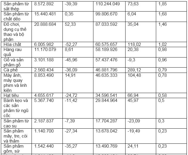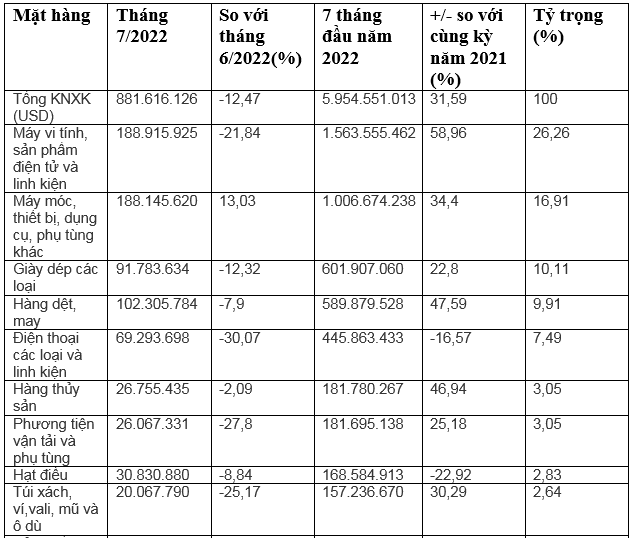 Những mặt hàng có kim ngạch xuất khẩu tăng trong 7 tháng năm 2022: Hàng thủy sản tăng 46,9%; sản phẩm từ sắt thép tăng 73,6%; cà phê tăng 289,1%; máy ảnh máy quay phim và linh kiện tăng 104,4%.