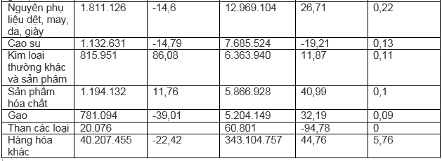 Tiếp đến là nhóm mặt hàng máy móc, thiết bị dụng cụ phụ tùng đạt 188,1 triệu USD, nâng tổng kim ngạch 7 tháng năm 2022 1 tỷ USD tăng 34,4%; tiếp đến là hàng giày dép đạt 91,7 triệu USD, tính chung 7 tháng đầu năm đạt 601,9 triệu USD, chiếm 10,1% tỷ trọng xuất khẩu.
