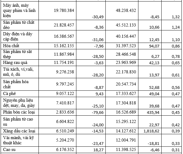 Tiếp đến là nhóm ngành hàng máy vi tính, sản phẩm điện tử và linh kiện đạt 640,5 triệu USD, chiếm 17,5% tỷ trọng.