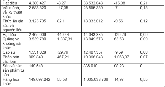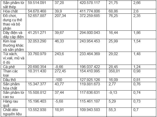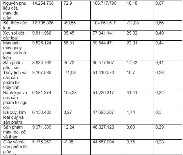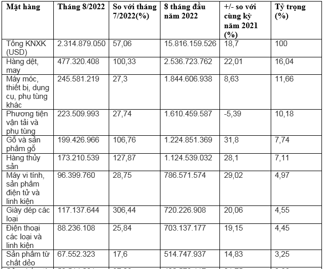Dẫn đầu kim ngạch xuất khẩu trong 8 tháng đầu năm 2022 là: Hàng dệt may đạt 2,53 tỷ USD, chiếm 16% tỷ trọng xuất khẩu, tăng 22%. Tiếp đến là máy móc, thiết bị, dụng cụ, phụ tùng khác đạt 1,84 tỷ USD, tăng 8,6%, chiếm 11,6%.