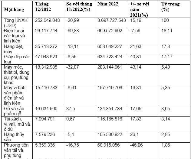 Theo số liệu thống kê của Tổng cục hải quan, kim ngạch xuất khẩu hàng hóa Việt Nam sang Pháp trong tháng 12/2022 đạt 252,6 triệu USD, giảm 20,9% so với tháng trước đó.