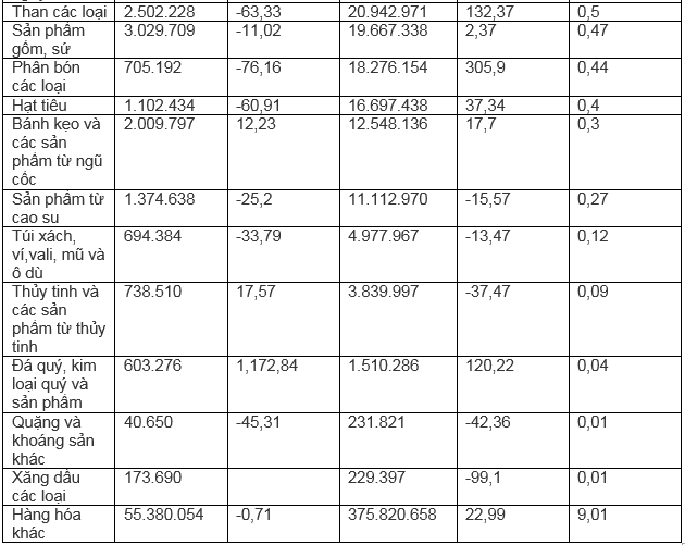Tiếp đến là nhóm hàng máy móc, thiết bị, dụng cụ và phụ tùng đạt 514,8 triệu USD, tăng 61,9%, chiếm 12,3% tỷ trọng xuất khẩu. Tiếp theo là mặt hàng dầu thô đạt 383,4 triệu USD, tăng 62,6%, chiếm 9,1% tỷ trọng.