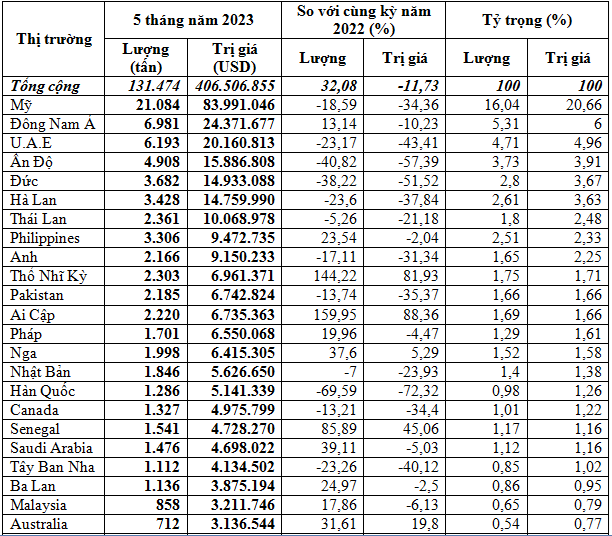 Nhìn chung, xuất khẩu hạt tiêu sang hầu hết các thị trường trong 5 tháng đầu năm 2023 sụt giảm kim ngạch so với 5 tháng đầu năm 2022.