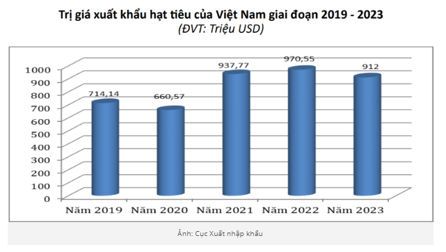 Cục Xuất nhập khẩu (Bộ Công Thương) dẫn số liệu thống kê của Tổng cục Hải quan cho biết, ước tính, năm 2023, Việt Nam xuất khẩu hồ tiêu đạt 267 nghìn tấn, trị giá 912 triệu USD, tăng 16,6% về lượng, nhưng giảm 6,0% về trị giá so với năm 2022. Giá xuất khẩu bình quân hồ tiêu của Việt Nam đạt khoảng 3.420 USD/tấn trong năm 2023, giảm 19,4% so với năm 2022.