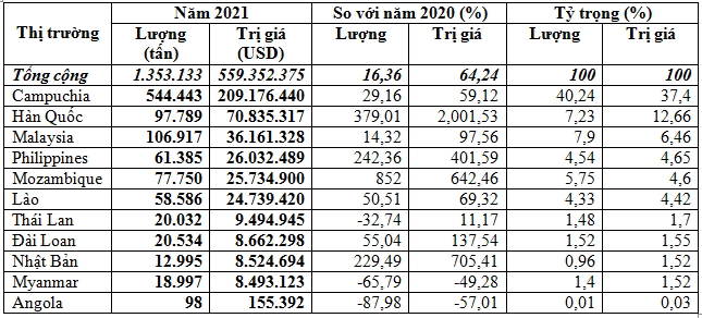 Xuất khẩu sang thị trường Philippines 61.385 tấn, tương đương 26,03 triệu USD, tăng 242,4% về khối lượng, tăng 401,6% về kim ngạch so với năm 2020.