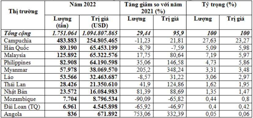 Riêng tháng 12/2022 xuất khẩu sang thị trường Campuchia tăng mạnh trở lại 67,6% về khối lượng, tăng 93,5% về kim ngạch, tăng 15,4% về giá so với tháng 11/2022, đạt 44.473 tấn, tương đương 22,9 triệu USD.