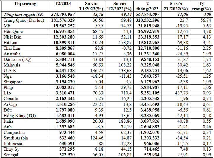 Đứng sau thị trường chủ đạo Trung Quốc là thị trường Mỹ đạt 31,82 triệu USD, giảm 19,3% so với cùng kỳ năm 2022, chiếm 5,6%; Hàn Quốc đạt 26,99 triệu USD, tăng 12,6%, chiếm 4,8%; Nhật Bản đạt 23,32 triệu USD, tăng 17,2%, chiếm 4,1%...