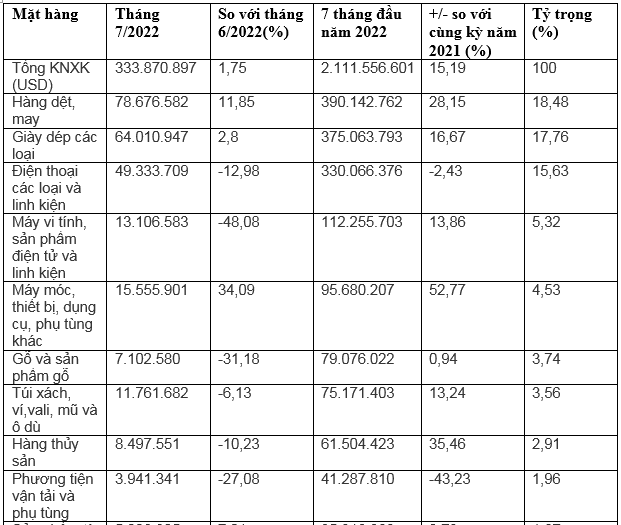 Số liệu xuất khẩu sang Pháp 7 tháng năm 2022