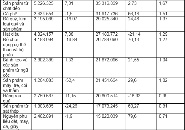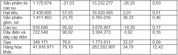 Tiếp đến là giày dép, đạt 375 triệu USD, tăng 16,6% so với cùng kỳ năm trước, chiếm 17,7% tổng kim ngạch xuất khẩu. Tiếp theo là nhóm mặt hàng điện thoại các loại và linh kiện đạt 330 triệu USD.