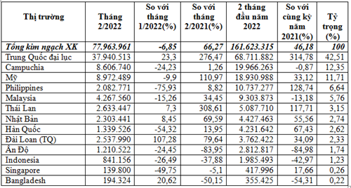 Đứng sau thị trường chủ đạo Trung Quốc là thị trường Campuchia chiếm tỷ trọng 12,4%, đạt gần 19,97 triệu USD, giảm 0,9%; riêng tháng 2/2022 xuất khẩu sang thị trường này đạt 8,61 triệu USD, giảm 24,2% so với tháng 1/2022 nhưng tăng nhẹ 1,3% so với cùng tháng năm trước.