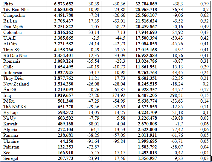 Tiếp đến thị trường Trung Quốc trong tháng 6/2023 giảm 18,8% so với tháng 5/2023 và giảm 8,6% so với tháng 6/2022, đạt 121,97 triệu USD; cộng chung cả 6 tháng năm 2023 xuất khẩu sang thị trường này giảm 23,5% so với 6 tháng năm 2022, đạt trên 634,35 triệu USD, chiếm 15,3% trong tổng kim ngạch xuất khẩu nhóm hàng này của cả nước.