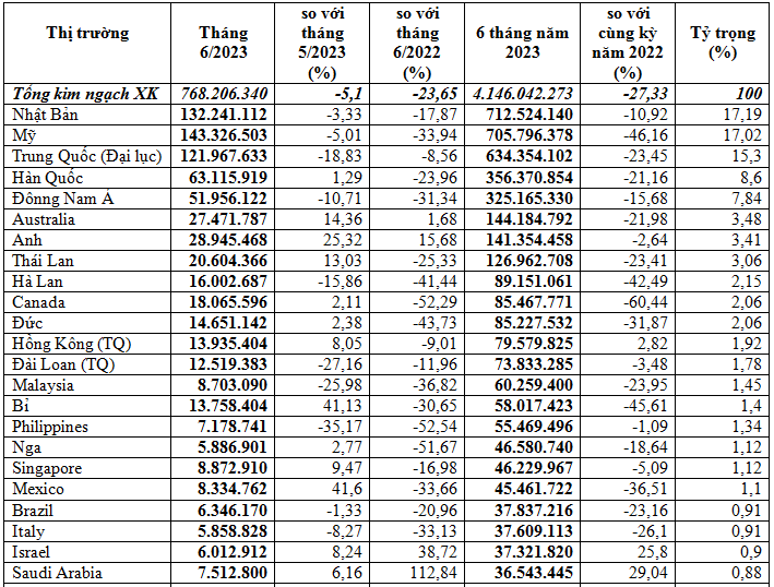 Đứng thứ 2 về kim ngạch là thị trường Mỹ chiếm tỷ trọng 17%, đạt gần 705,8 triệu USD, giảm mạnh 46,2% so với cùng kỳ; riêng tháng 6/2023 xuất khẩu sang thị trường này đạt 143,33 triệu USD, giảm 5% so với tháng 5/2023 và giảm mạnh 33,9% so với tháng 6/2022.