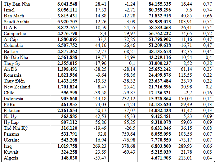 Tiếp đến thị trường Trung Quốc trong tháng 12/2022 giảm 18,2% so với tháng 11/2022 và giảm 10% so với tháng 12/2021, đạt 104,05 triệu USD; cộng chung cả năm 2022 xuất khẩu sang thị trường này tăng mạnh 61,2% so với năm 2021, đạt trên 1,57 tỷ USD, chiếm 14,3% trong tổng kim ngạch.