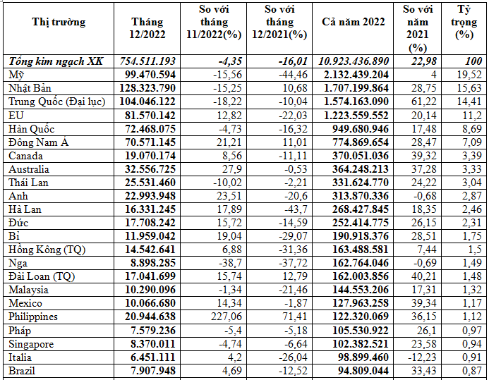 Đứng thứ 2 về kim ngạch là thị trường Nhật Bản chiếm tỷ trọng 15,6%, đạt gần 1,71 tỷ USD, tăng 28,8%; riêng tháng 12/2022 xuất khẩu sang thị trường này đạt 128,32 triệu USD, giảm 15,3% so với tháng 11/2022 nhưng tăng 10,7% so với tháng 12/2021.