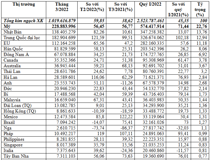 Thủy sản xuất khẩu nhiều nhất sang thị trường Mỹ chiếm 22,8% trong tổng kim ngạch xuất khẩu nhóm hàng này của cả nước, đạt trên 574,42 triệu USD, tăng mạnh 71,4% so với quý I/2021; trong đó riêng tháng 3/2022 đạt 228,88 triệu USD, tăng mạnh 56,5% so với tháng 2/2022 và tăng 56,8% so với tháng 3/2021.