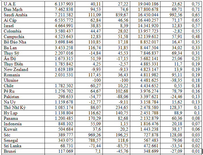 Tiếp đến thị trường Trung Quốc trong tháng 3/2022 tăng mạnh 121,6% so với tháng 2/2022 và tăng 99,5% so với tháng 3/2021, đạt 182,9 triệu USD; cộng chung cả quý I/2022 xuất khẩu sang thị trường này cũng tăng mạnh 102% so với quý I/2021, đạt 326,67 triệu USD, chiếm 12,9% trong tổng kim ngạch.