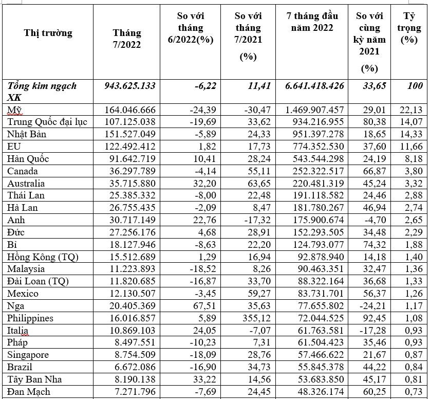 Mỹ vẫn là thị trường duy nhất đạt trên tỷ USD trong 7 tháng đầu năm, chiếm 22,1% trong tổng kim ngạch xuất khẩu nhóm hàng này của cả nước, đạt gần 1,47 tỷ USD, tăng mạnh 29% so với cùng kỳ năm 2021; trong đó riêng tháng 7/2022 đạt 164,05 triệu USD, giảm 24,4% so với tháng 6/2022 và giảm 30,5% so với tháng 7/2021.