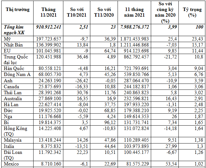 Riêng tháng 11/2021 kim ngạch giảm 9,7% so với tháng 10/2021 nhưng tăng 36,4% so với tháng 11/2020, đạt 197,72 triệu USD.