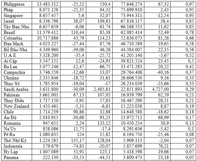 Đứng thứ 3 là thị trường EU đạt 914,12 triệu USD, chiếm 11,4%, tăng 9,9% so với cùng kỳ. Xuất khẩu thủy sản sang thị trường Trung Quốc chiếm 10,8%, đạt 862,79 triệu USD, giảm 21,7% so với cùng kỳ năm trước.
