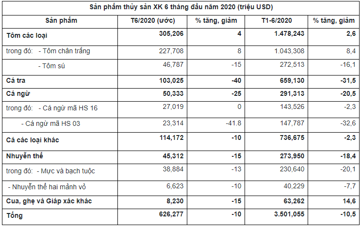 Lũy kế 6 tháng đầu năm 2020, XK thủy sản của cả nước ước đạt trên 3,5 tỷ USD, giảm 10% so với cùng kỳ năm ngoái. Trong đó, giảm sâu nhất là cá tra (-31%), cá ngừ và mực bạch tuộc đều giảm 20%, các loại cá biển khác giảm nhẹ 2%. Chỉ có tôm giữ được mức tăng khiêm tốn gần 3%.